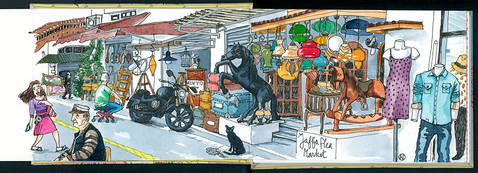 Nathan is an israeli ceramist and illustrator living in Tel Aviv, he used to illustrate for children books and work for architects, he is now teaching ceramic and is an obsessive urban sketcher ! The scenes he catched for Marina's sketchbook show small restaurants selling humus and falafel on King George, a very popular (and chaotic) street in the middle of Tel Aviv.
